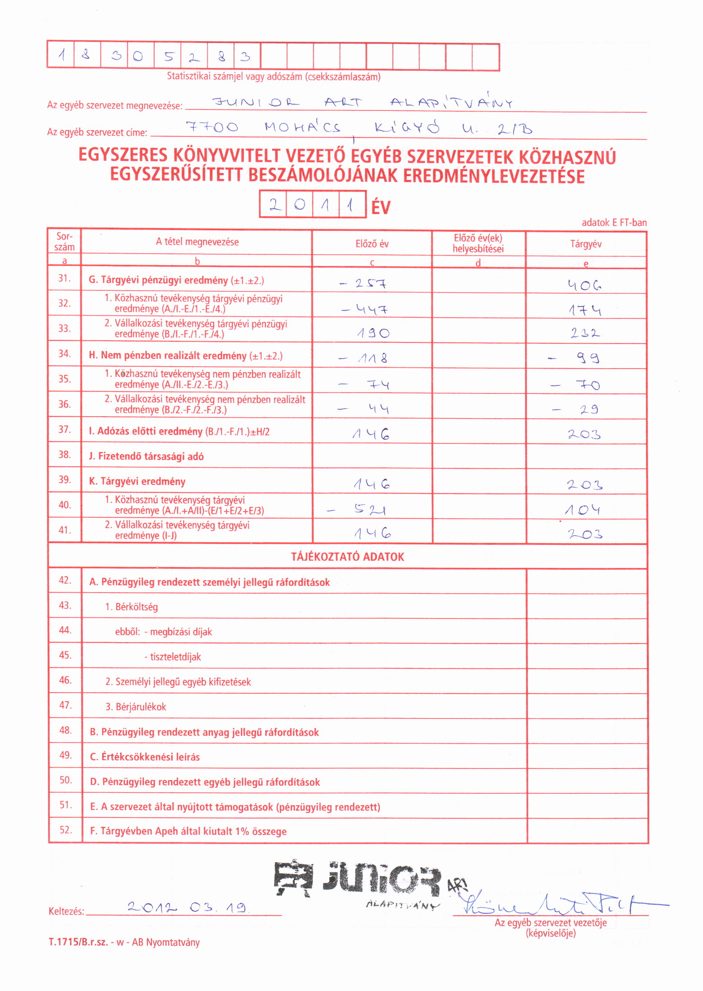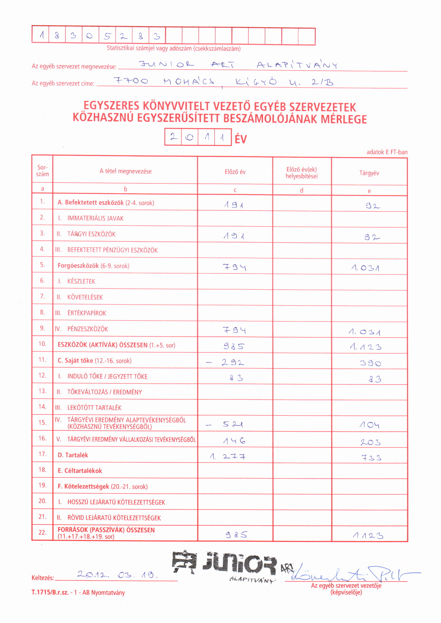 Mohács város önkormányzata 2011-ben a civil szervezetek részére elkülönített alapjából a Junior Art Alapítványt 80.000 Ft működési támogatásban részesítette. A Mohácsi Horvát Önkormányzat 300.000.- Ft, a Szerb Kisebbségi Önkormányzat 40.000.- Ft támogatást nyújtott alapítványunknak, a Baranya Megyei Önkormányzat elnöke 20.000.- Ft támogatást adott.